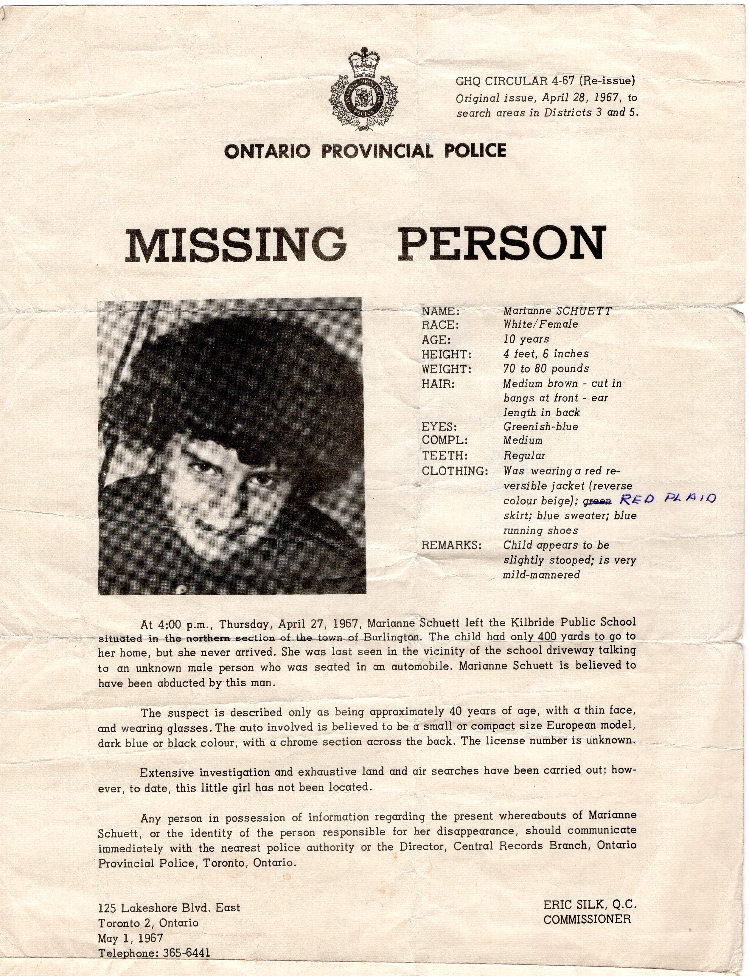 Marianne was born on September 29, 1956. The Schuett family lived on Oak Street in Hespeler, and Marianne attended kindergarten at Centennial Public School before they moved to Kilbride in 1965. Her older brother, David, was fifteen when his sister went missing.
