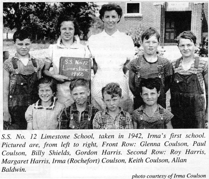 Limestone School on Derry Road, the location of Irma’s first teaching position, is now the home of a former student from Frontenac School. Her starting salary in 1939 was $850 a year and she paid $25 a month for room and board staying at three different homes in the area, two years with George and Marion Coulson, two year at the Burness Coulson home. There were eight students to start the year and as the year went on several families moved in giving a grand total near 25, grades one to eight. There was no playground supervision, the kids played outside on their own and invented their own games. The teacher was judged by the Christmas Concert which had to include something sacred, a drill and something periodic. With eight students to take all the parts it became quite a challenge.