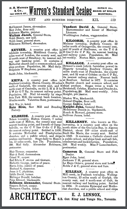In the Polk Gazetteer of 1886, Dr. A. C. Jones is listed as the physician in Kilbride. He was rumoured to have been the physician for about 35 years.