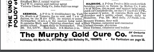 In both the 1892 and 1895 Province of Ontario Gazetteers, Dr. George Carbert is listed as a physician. It would seem that here were two physicians in Kilbride. It could very likely be the case that one lived and serviced the residents in the Cumminsville area. Cumminsville was in decline at that time because of the 1884 explosion at the Powder Mills. He may have chosen to advertize his practice under Kilbride. It could also have been the case that there were sufficient patients for two physicians.
