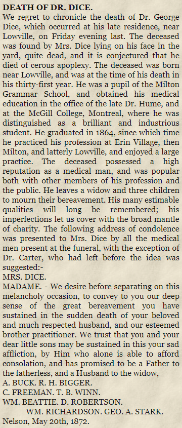 Physicians who practiced in the Lowville area have been difficult to find. In 1872, the Milton Canadian Champion printed an obituary for a Dr. George Dice. Unfortunately he passed away at the young age of 31. He was born near Lowville, his early education was in Milton and he received his medical degree from McGill. He practiced in Erin Village, Milton and lastly in Lowville. The obituary is interesting to note who his ‘brother practitioners’ were. Kilbride’s Dr. Beattie was one.