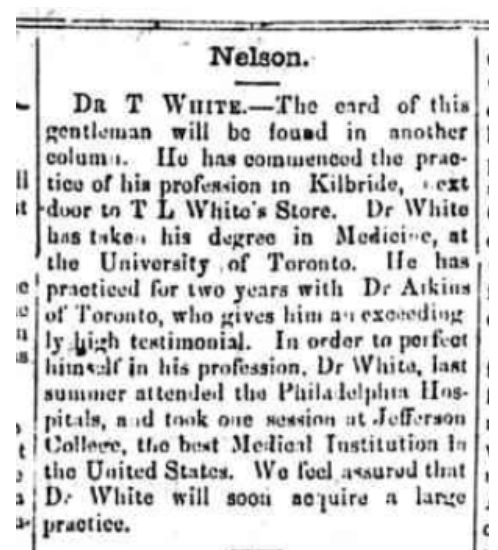 The Milton Canadian Champion printed an advertisement On October 19, 1865 for a Dr. T. White who ‘commenced’ a practice in Kilbride. This practice was located next door to the T. L. White Store. Information provided by a descendant of T. L. White confirms that there was no familial relationship between the men. Dr. White was well trained having attended the University of Toronto and practiced with a Dr. Atkins in that city. It is not know how long he practiced in the village.