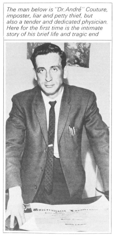 Shortly afterwards, Couture had found a champion in Oakville who he met during his ambulance service. This man was told that Couture had completed his medical studies short of his internship. Through this man he was introduced to the Oakville Trafalgar Hospital Board. In order to confirm Couture’s claims, this gentleman conducted his own verification of Couture’s credentials. He contacted Couture’s family physician and his current employers. Mrs. MacBeth called the medical school at the University of Toronto only to find that Couture was not enrolled in any classes. The family physician wired Laval Medical School to confirm that Couture was a graduate as he claimed. As expected, the University verified that Dr. André Couture was indeed a graduate. We know that the real Dr. Couture did in fact graduate as a physician from Laval.