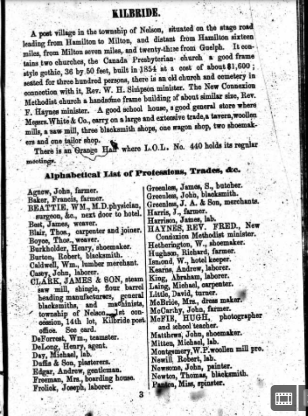 In September of 1869, William Beattie and his wife, purchased a lot in Kilbride on the south side Thomas Street. It was part of Lot 9, Concession 2. This lot was to the west of Jane Street where Thomas Lyon White had purchased a number of lots that he provided to the staff working in his store at the corner of Thomas and Rebecca Streets. A village doctor would have been a welcome purchaser.