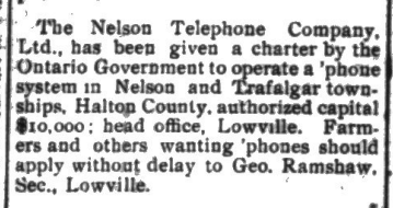 About 1907, The Nelson Telephone Company Limited was given a charter by the Ontario Government. The Company was authorized to operate a phone system in the Townships of Nelson and Trafalgar with $10,000 in capital. The Village of Lowville, in Nelson Township, would house the main office.