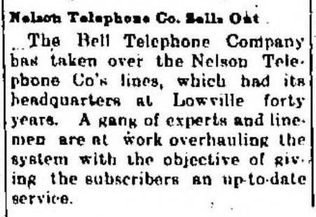 In 1925, The Bell Telephone Company took over the Nelson Telephone Co. lines. The system was overhauled at that time to bring it up to date. The article which appeared in the Georgetown Herald on April 22, 1925 reported that the headquarters were in Lowville for 40 years. This does not align with the local folklore that the Company was founded in 1907.