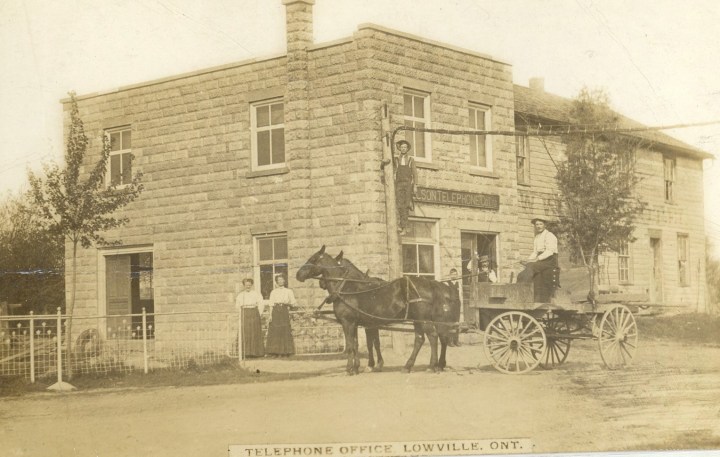 Some of the local Lowvillians such as E. B. Coulson and James Auckland worked for the Company helping to transport poles and equipment. Ladies held positions as telephone operators. In the photo, Millie Coulson and Mrs. C. Readhead represent the operators.