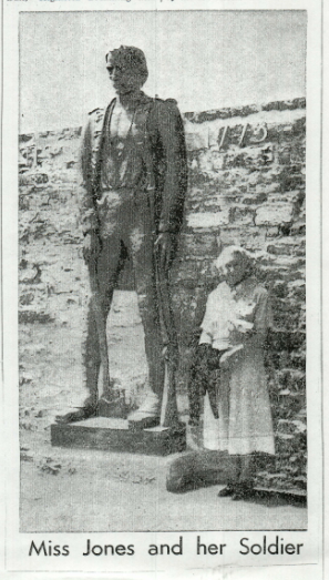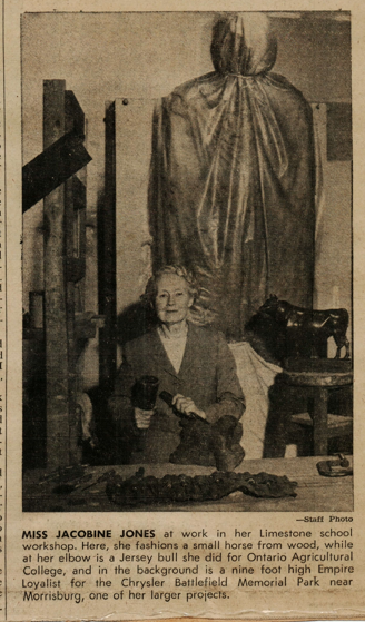 Some local residents can still remember when she was working on a large statue of a United Empire Loyalist Soldier who can now be found at Upper Canada Village. Jacobine hired one of the local young men to pose. A portion of the roof had to be removed to accommodate the statue’s height.