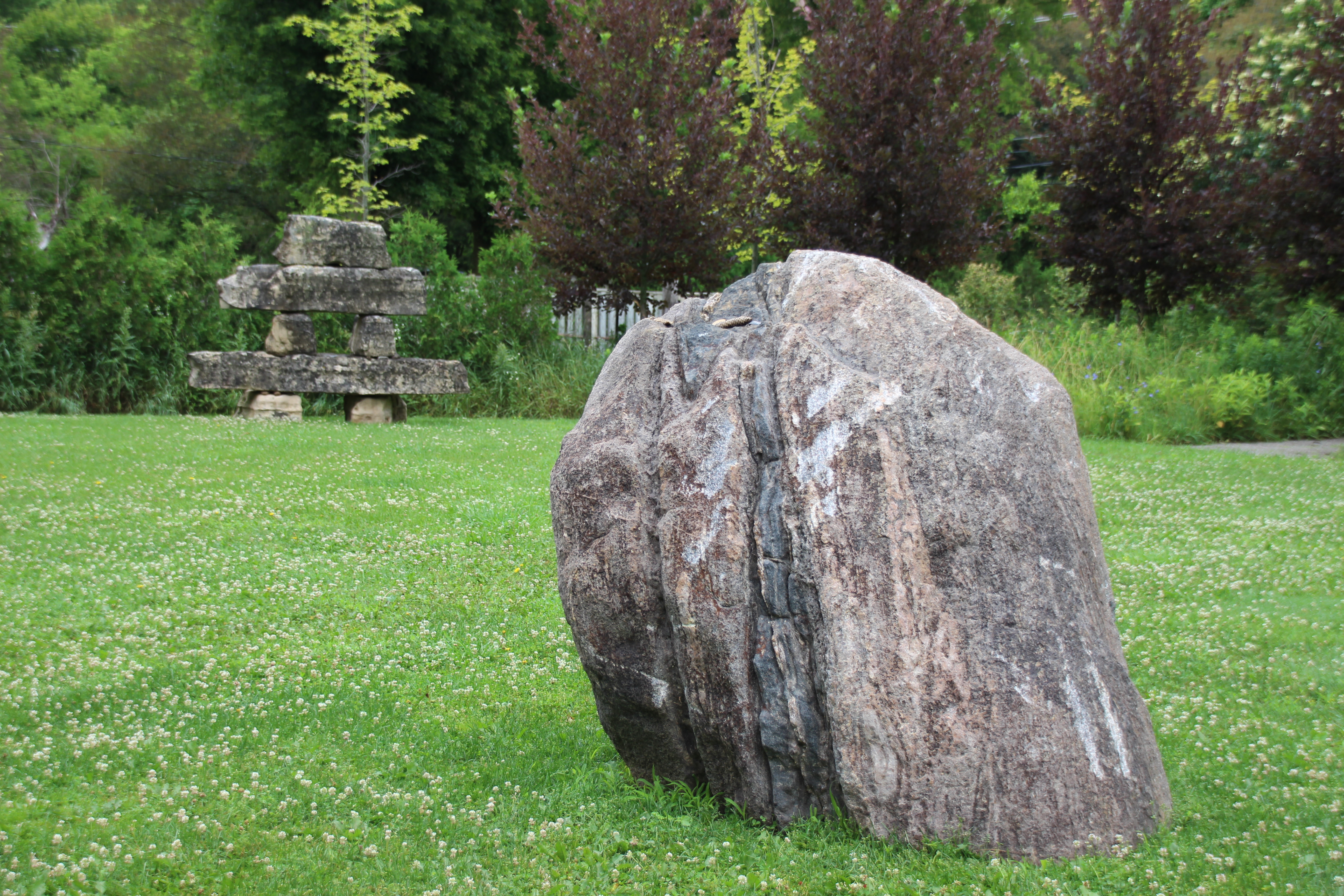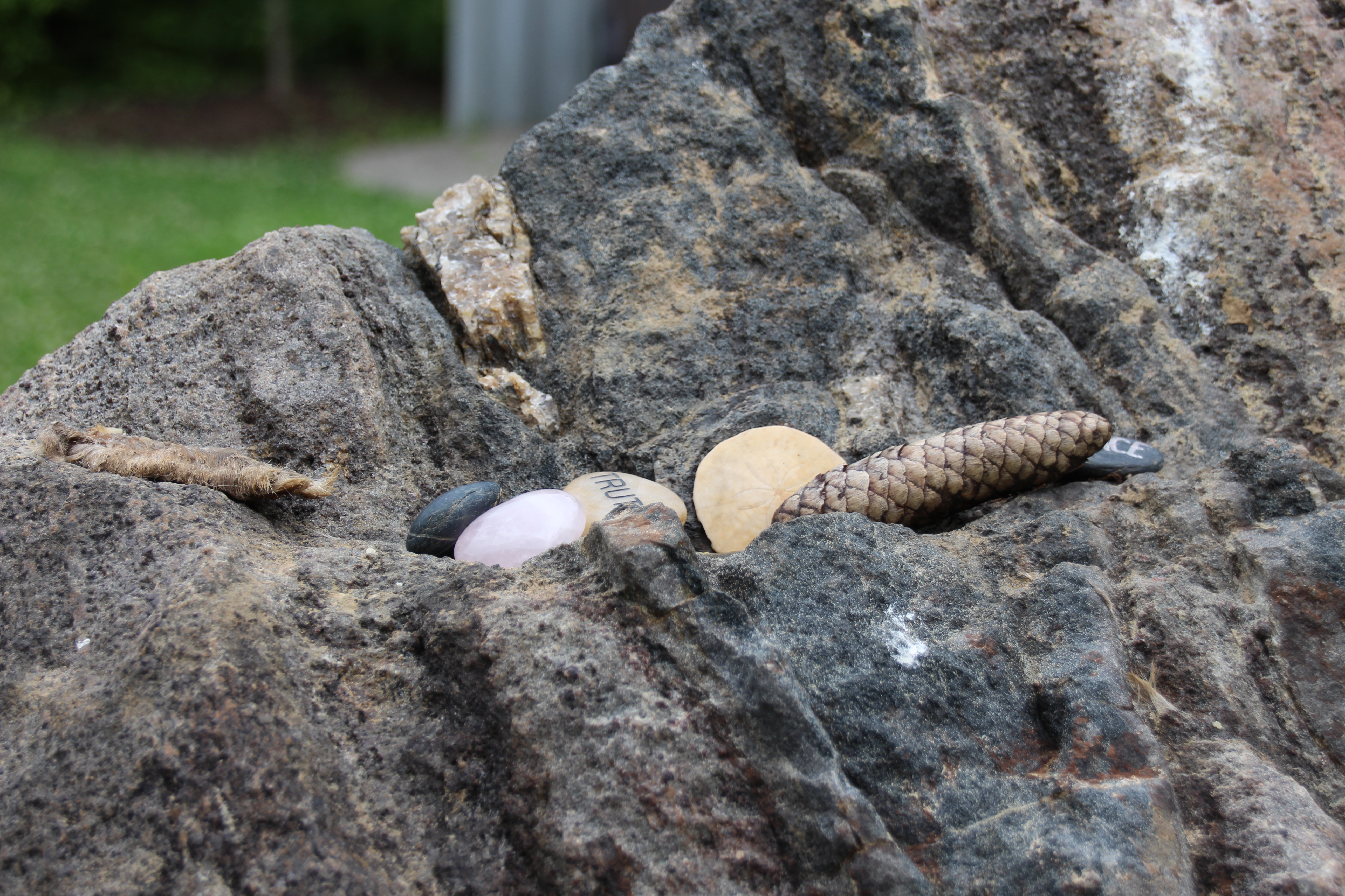 One of the installations is what Walt calls, “the belly button of Lowville”. The inspiration came from the omphalos from Greek mythology meaning naval. A stone artifact was placed by Zeus at the centre of the earth. Lowville’s omphalos can be found deep in Walt’s sculpture garden. As you will see, visitors often leave mementos on the stone