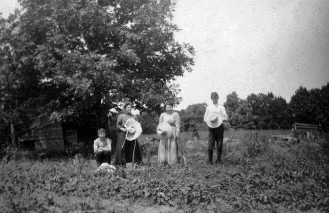 In Kilbride Abner became a market gardener, growing and selling berries, fruit and vegetables. He continued to keep bees (a 1906 directory lists him as an apiarist) and some of his old Darbyville customers traveled to Kilbride for his berries and honey. A 1934 airphoto shows his land between Kilbride, McNiven and Cedar Spring Roads, still being used for gardens and orchards, and a Google Earth image shows it as it appears now. In a letter written to his daughter Ethel on September 13, 1914, Abner noted that “There is nothing doing since the War started, business is very dull”. He then goes on to describe the state of his garden “Pulled some watermelons last night, very nice ones. Hope to have about 40 bushels potatoes, strawberry plants look pretty and raspberry bushes are very fine. The land about here is very good. Have it set out 100 black currants, 100 red, 400 raspberries, 10 pears, 8 apple, 27 cherry. Crop mostly very good”. A 1911 photograph shows Maude Pickett and helpers in their strawberry patch.