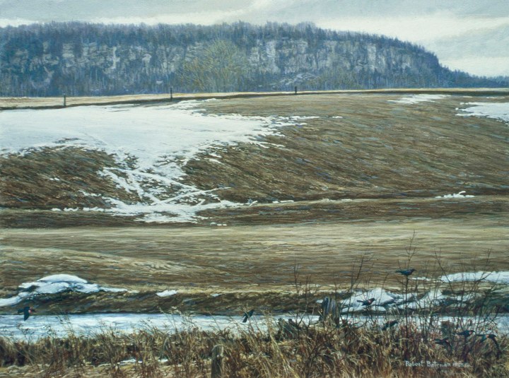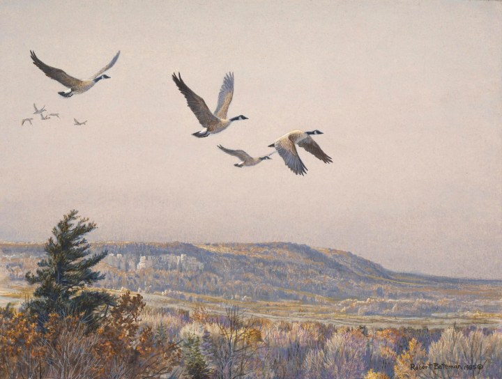Robert Bateman began teaching at Nelson High School in Burlington, Ontario in 1958. Shortly afterwards he purchased 10 acres of land on Britannia Road. This location offered wonderful views and access to the Niagara Escarpment, the Bruce Trail and also provided inspiration for a number of his works. Many local residents still have fond memories of seeing Robert walking or hiking through the area. In August of 1985, he and his family moved to Salt Spring Island, B.C.